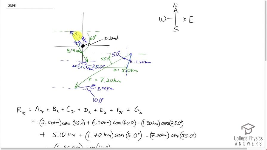 This is College Physics Answers with Shaun Dychko. Gilligan's raft is being blown in many different directions after he departs from this island, he goes along seven different vectors here and our job is to figure out what is Gilligan's final position? So first he travels 2.50 kilometers 45.0 degrees north of west, which is this blue vector, and then 4.70 kilometers 60.0 degrees south of east, which is this vector B, and then 25.0 degrees south of west, which is this vector C— 1.30 kilometers— then 5.10 kilometers directly east and 1.70 kilometers 5.0 degrees east of north and then 7.20 kilometers 55.0 degrees south of west and then 2.80 kilometers finally 10 degrees north of east. So the final position will be the resultant of all these vectors added together and I have placed them head to tail and so the resultant will be from the origin to the head of the last vector so this is the resultant position of the raft and we have to figure out what that is... what is that vector... its length and its direction. So there's two tricky things with this problem: one is that there are so many vectors and so many numbers involved that it's easy to make careless mistakes with copying numbers and so on but another issue is that this vector E is given with an angle compared to a vertical axis and that means that trigonometric function that we use for finding the components of E will be the opposite function that we are accustomed to for every other vector; more conventionally, angles are given with respect to a horizontal axis in which case you use cosine for finding an x component and sin for using a vertical component but in the case of E, the way it's drawn, the horizontal component will be... I am just going to redraw E over here so we can see it more easily. Suppose this is vector E, its horizontal component will be this— this is E x— and then its vertical component will be here—this is E y— and the angle that we are given is this 5.0 degrees in here and so the horizontal component is the opposite leg of this triangle and so we multiply E by sin of the angle 5.0 degrees to find the x component of it so we will get to that in a second but that's just something to be mindful of... the x component for every other vector will be using cosine. Okay! So let's get to work... we have to be very methodical here because there are just so many vectors involved. We need to find what the x component and the y component of the resultant is. So the resultant x component will be this vector here and its y component will be this thing here and the x component of the resultant will be the sum of the x components of all the other vectors that we are adding together. So its the x component of vector A, x component of vector B, C, D, E, F and G. So taking our coordinate system to be positive to the right and positive upwards, which is conventional although not rigidly necessary but we will just follow that usual convention that means the x component of vector A is negative because it's to the left and the x component is this little bit that goes here— that's the x component of vector A— or I have could have drawn it down here so that it more clearly is the adjacent leg of this triangle in yellow here. Okay! So it has a length of 2.50 kilometers—it's negative because it's to the left— and we are going to multiply it by cosine of 45.0 degrees to get the adjacent leg of this triangle and because the adjacent leg is the x component here. Then add to that the x component of vector B, which is to the right and so it's positive multiply 4.70 kilometers by cosine of 60.0 degrees so now we are focusing on this triangle here and it's this little bit here that we are looking for this is B x—the x component of vector B— and that's 4.70 times cosine of 60.0— it's the adjacent leg of this right triangle in yellow. Then we have vector C going somewhat to the left and so it has a negative x component and it's 1.30 kilometers times cosine of 25.0 degrees then vector D is entirely in the x direction so there's no need for a trigonometric function although you could multiply by cosine of 0 if you like and that's got to be 5.10 kilometers to the right—positive— and then we have 1.70 kilometers times sin of 5.0 degrees and we discussed how this is the opposite leg of this triangle— we are looking for the opposite leg of this triangle to find the x component and so that's why we are using sin— and then minus 7.20 kilometers times cosine of 55.0 degrees to get the x component of vector F and so I will outline the vector F triangle in yellow here... let's make it a different color... let's make it light blue so it's this triangle we are concerned with now... and that's 7.20 kilometers times cosine of 55.0 degrees— minus because it's to the left— and then 2.80 kilometers times cosine of 10.0 degrees gives us the adjacent leg of this triangle and that's positive because that component is to the right and so that's 2.80 kilometers times cosine of 10.0. This all works out to 3.2799 kilometers that is the x component of the resultant. Okay! Then we need to think about the y component and pretty much the same process but just thinking about the vertical component. So we have 2.50 kilometers times sin of 45.0 to get this vertical component of vector A and then minus 4.70 kilometers times sin of 60.0 because this vector B is downwards and to the right and so while its x component is positive, its y component is negative because it's going down and so that's the opposite leg of this triangle here and so we are using the sin of 60.0 multiplied by the hypotenuse that's minus 4.70 times sin of 60.0 and then minus 1.30 kilometers times sin 25.0— we are looking for the opposite leg of this triangle now and that's downwards so that's negative as well. Vector D has no y component so we can skip that one. Vector E has a vertical component, which is the adjacent leg of this triangle so we use cosine of 5.0 degrees ti