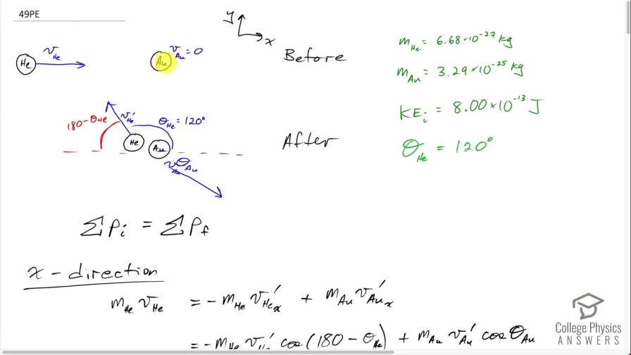 This is College Physics Answers with Shaun Dychko. This question is based on the Ernest-Rutherford experiment that demonstrated that the nucleus of an atom is small and dense. So it shows that it's small because this incoming helium nucleus would not get deflected very much most of the time... most of the time, it would miss the gold nucleus and zip on past maybe without getting deflected or maybe just getting deflected a tiny bit and so on but every once in a while, a helium nucleus would hit the gold nucleus dead on and have a dramatic reflection... have a dramatic change in its momentum and so the infrequency of this occurrence shows that the nucleus of the gold atom is small because not very many of these incoming helium nuclei would hit the nucleus of the gold atom and then also it shows that the gold nucleus is dense because there's so much mass in that tiny space enough to cause such a dramatic change in momentum of the helium nucleus. Okay! So we make some assumptions about what the incoming kinetic energy of the helium nucleus is— we are told that it's 8.00 times 10 to the minus 13 joules— we are given the mass of the helium nucleus and the mass of the gold nucleus abbreviation for gold is Au for some reason... I should probably look that up but it doesn't make sense really because it's not to do with the word 'gold'... probably Latin or something like that... just like 'iron' has an abbreviation Fe. So we have the masses and the kinetic energy of the helium nucleus and the angle of deflection. So it deflects at an angle of 120 degrees with respect to its direction of its initial velocity so it's being deflected somewhat backwards and up. Okay! After the impact—so this is the after picture here by the way— after the impact, we have the gold nucleus also moving recoiling due to the impact and it's going to have some speed v Au and some angle θ Au below the positive x-axis. Initially, the gold nucleus is stationary and that's all we need to know to figure out the speed of the helium nucleus after impact anything after impact is denoted with a prime so that's v He prime is to say the speed of the helium nucleus after collision... there's a little ' here too but it's kind of hard to see... maybe if I move it like this, you will see it... I didn't catch it... this is v Au prime here and we want to find out the angle of the velocity of the gold nucleus after impact as well as its speed. So in other words, the velocity of the gold nucleus after impact is one question which consists of two pieces of information— its direction and speed— and since we are given the direction of the helium nucleus after impact, we need to find only its speed. Okay! Momentum is conserved, which is to say the total momentum initially before impact equals the total momentum final after impact and this is true independently in the x and y-directions. So let's consider the x-direction. We will take the total momentum in the x-direction on one side initially and then we have the total momentum in the x-direction on the right hand side after impact. So initially, there is no momentum for the gold nucleus and so we have only the momentum of the helium nucleus but since we have chosen our x-axis to be along the initial direction of the helium nucleus that means all of its momentum is in the x-direction so there's no trigonometry needed to figure this part out. So this is mass of the helium nucleus times the speed of the helium nucleus on the left— that is the total momentum of the system. On the right hand side, we have the helium nucleus going in to the left in the x-direction and so we have a negative sign here to indicate that. I prefer to put negative signs explicitly in the formulas like this— it makes more sense to me— and I am going to use reference angles in the trigonometry so that we always get a positive answer to our, you know, cos of the angle or sin of the angle. So I'll use 60 degrees here, which is 180 minus 120. Okay! So if you had chosen to use cosine of 120 and had a plus here and that would be fine, you would end up with a negative as well. Okay! So add to that the mass of the gold nucleus plus the x-component of the gold nucleus velocity after impact. Okay! So we have negative mass of the helium times speed of the helium after impact times cosine of this reference angle— 180—minus the angle of recoil of the helium nucleus and add to that the x-component of the gold's nucleus momentum after impact And so we use cosine of this angle here because this is the adjacent leg of this triangle here so this is the momentum for the gold nucleus after impact and it has an x-component here and a y-component here this is v Au prime x component and v Au prime y component. Okay! And the x-component is to the right so it's positive and that's why there's a plus sign there. Alright! I am going to replace the 180 minus θ He I am going to replace it with 180 minus 120; now normally, I don't substitute for variables until the very end after doing a bit of algebra and that's usually a good idea but it just works out more nicely and saves us some writing to substitute for just this one number right now so I am going to plug in 120 for the recoil angle of the helium nucleus. And this makes cosine of 60 and cosine of 60 is a special answer because you should it's worth committing this triangle to memory... this triangle has sides of 1, hypotenuse 2 and this leg is root 3 provided this angle is 30 and this angle is 60 and this is a right angle here. And from this picture, we can see that the cosine of 60 is one-half— adjacent divided by hypotenuse— so this whole thing can be replaced by one-half and that's what I have done here... that's why it's divide by 2 because I am multiplying by a half here and otherwise, this line is unchanged. Okay! This is equation (1) that's as much as we can do in our consideration of the x-direction because at this point, we don't know the speed of the helium nuc