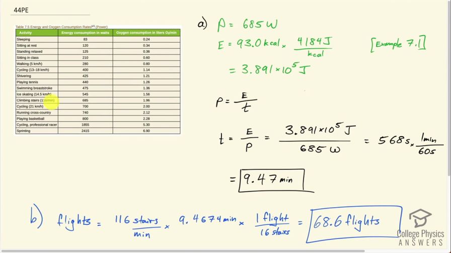This is College Physics Answers with Shaun Dychko. In this question, we are going to figure out for how long someone could climb stairs at a rate of 116 steps per minute using the energy in 10 grams of butter? So this butter has 93.0 kilocalories of energy and we need to convert that into joules by multiplying by 4184 joules per kcal— that's a conversion factor that we saw used in example [7.1]— and we need m.k.s units for our formulas— that is meters, kilograms and seconds— and so joules is an m.k.s unit because it works out to kilograms meters per second squared times meters... this part here is Newtons, which is mass times acceleration and then multiplying that by distances... how you calculate energy or work done: force times distance. Okay! So joules is kilograms meters squared per second squared, in other words, which is to say it is an m.k.s unit— it's a metric unit— and that's what we need for our formulas. Okay so that's 3.891 times 10 to the 5 joules of energy in 10 gram pat of butter. The power output is 685 watts, which we look up in this table [7.5] where we have 685 watts is the power for climbing stairs at 116 steps per minute. And then we can say power is the rate of energy use or energy divided by time in other words and we can solve this for t to answer this question. So we multiply both sides by t divided by P and then the power cancels on the left, time cancels on the right and we are left with time equals energy divided by power. So that's 3.891 times 10 to the 5 joules divided by the 685 watts which is 568 seconds, which is easier to understand if we convert it into minutes so multiply by 1 minute for every 60 seconds and we are left with 9.47 minutes. And part (b) asks how many flights can you climb during this 9.47 minutes? So if we are climbing 116 steps per minute that gives us the total number of steps up to this point, minutes cancel because they are on opposite sides of this fraction and then we have 1 flight for every 16 steps or stairs, whichever word you prefer, and this works out to 68.6 flights.
