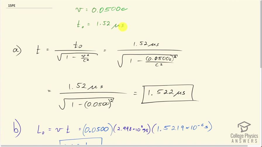 This is College Physics Answers with Shaun Dychko. An observer at rest with respect to a muon will measure its lifetime to be 1.52 microseconds so in other words, in the rest frame of the muon, this is its lifetime and so this is the proper time. And then suppose that the muon is going to move at a speed of 0.0500 times the speed of light c, what will its lifetime be then? Well that will be the proper time divided by square root 1 minus v squared over c squared. So that's 1.52 microseconds divided by square root of 1 minus 0.0500c all squared over c squared, the c squared's cancel leaving us with 1.52 microseconds divided by square root 1 minus 0.0500 squared, which is 1.522 microseconds. I am keeping an extra significant figure here beyond what's appropriate based on the values that we are given just to show the effect of relativity. So this is how long an Earth based observer would measure the lifetime of the muon to be— 1.522 microseconds— its lifetime is slightly dilated because the fact that it's moving past so quickly. Part (b) asks for the distance that the Earth based observer will measure for the distance that the muon will travel during its lifetime. So that's 0.0500 times the speed of light 2.998 times 10 to the 8 meters per second multiplied by the lifetime as observed by the Earth based person— this is the dilated lifetime— and that's 228.1 meters. And this is called proper length—L naught— because an Earth based observer is at rest with respect to the point where the muon comes into existence and the position where it decays so because this Earth based observer is not moving with respect to these start and end positions, the distance that they measure is the proper length. Now the distance the muon travels according to the muon, in the muon's frame, is going to be a length contraction distance L and that's going to be the proper length multiplied by square root 1 minus v squared over c squared. You could also calculate this by going L equals v multiplied by t that would be fine... or t naught I should say because this is how long the muon exists according to itself and it knows its going this speed— both frames of reference will give the same answer as to the speed— and then this would be the length according to the muon so you can try for yourself that this also will give the same answer as I am going to show here. Okay! So we have—the proper length— 228.13281 meters times square root of 1 minus 0.0500c squared over c squared, this works out to 227.8 meters is the distance that the muon will travel according to a reference frame moving with the muon or at rest with respect to the muon.