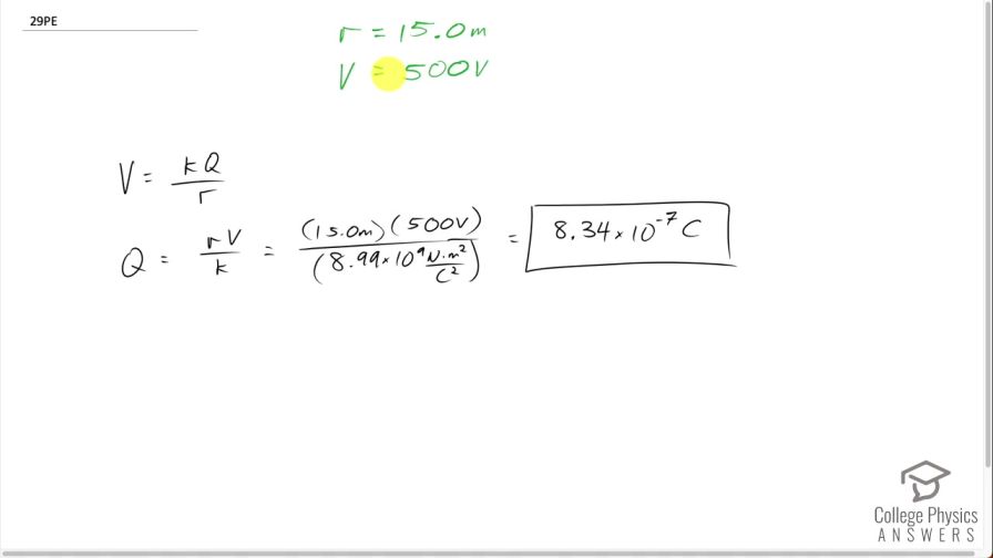 This is College Physics Answers with Shaun Dychko. At a distance 15.0 meters from a point charge, the potential is 500 volts and the question asks us to find out what is the sign and magnitude of the charge? So the formula for the potential due to a point charge is Coulomb's constant times the charge divided by the distance from it and we can solve this for Q by multiplying both sides by r over k and switching the sides around, we get Q equals rV over k and that's—a distance of—15.0 meters times —a potential of—500 volts divided by—Coulomb's constant of— 8.99 times 10 to the 9 Newton meters squared per Coulombs squared and that gives 8.34 times 10 to the minus 7 Coulombs and this charge is positive because it is a positive potential.