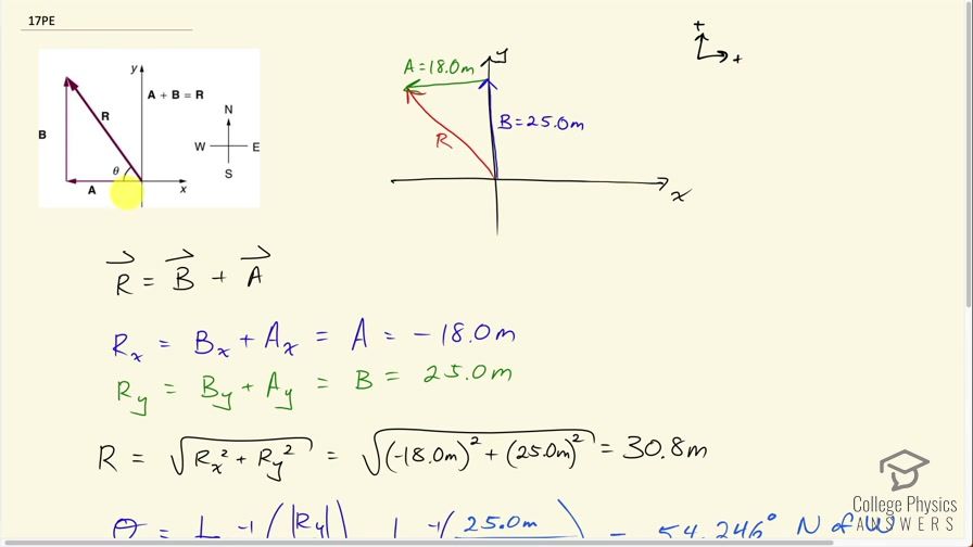 Exercise 3.16: Suppose you walk 18.0 m straight west and then 25.0 m straight north. How far are you from your starting point, and what is the compass direction of a line connecting your starting point to your final position? (If you represent the two legs of the walk as vector displacements A and B, as in Figure 3.60, then this problem asks you to find their sum R = A + B.)