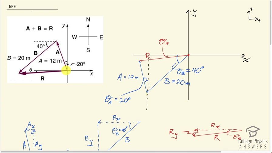 This is College Physics Answers with Shaun Dychko. In problem 6, we are going to confirm that when we walk along vectors A and B in a different order compared to question (5)— in question (5), we walked first along vector A and then along vector B and ended up at some final position— now in question (6), we are going to walk first along vector B and then along vector A and see if we end up in the same final position and we can tell graphically that we are expecting that we will and we will be showing that when you have vector A plus vector B equaling some resultant that is the same as vector B plus vector A equaling the same resultant so the order of addition does not matter is what we are going to show here. We are going to add vectors A and B using components. So we have some resultant vector here and it has a component R x— the x component of the resultant— and then some component downwards R y and we will find the R x component by adding the x component of vector B to the x component of vector A and you can see that if you were to copy them and move them over... if you have vector A here and then add to that vector B... x components of course... you will end up with the x component of the resultant. So that's a graphical way of showing that and we are going to do it numerically down here and the same is true for the y component of the resultant. Now the y component of vector A is in the upward direction opposite to the y component of vector B, which is downwards but vector B has a y component downwards a bit more than vector A's y component is upwards and so we are left with a little bit downwards remaining when we add these two together. Okay! So we have to remember how to find the legs of a right triangle... this is a right triangle because it has a ninety degree angle here and this is a right triangle with a ninety degree angle there and the x component is called the opposite leg because it is opposite to the angle that we know— Θ A, which is 20 degrees— and this x component for vector B is called the adjacent because it's adjacent or beside the angle that we know—Θ B. So vector B is 40 degrees south of west so that means goes downward in this Southerly direction starting from west which is this negative x axis here. And vector A is at a direction 20 degrees west of north so 20 degrees towards the west which is left compared with north as our starting point so 20 degrees that way. Alright! So let's find the x component of the resultant by adding the x component of vectors A and B. So for vector A, this x component is pointing to the left, which is the negative direction conventionally, so we put a negative sign there to indicate that it's going to the left and then we multiply the length of the vector—the hypotenuse, in other words— by sin of Θ A because we know that the sin of an angle—Θ A, in this case— is the length of the opposite which is the x component of vector A divided by the hypotenuse which is just A and we can solve for A x by multiplying both sides by A and then switch the sides around, put A x on the left and then we are left with AsinΘ A on the right side and that's where this part comes from which is this. Okay! And the same kind of story with the x component for vector B except that we are using cosine since we have... the adjacent leg is what we are trying to find. So cosine of Θ B is the adjacent which is B x divided by the hypotenuse and then solve for B x by multiplying both sides by B. Alright! So then we plug in numbers. So we have negative 12 meters times sin of 20 degrees minus 20 meters times cosine of 40 degrees and this is negative 19.425 meters and we are keeping lots of digits here since this is an intermediate calculation— we don't round until the final answer. For the y component of the resultant, we want to combine the y component of vector A with that of vector B and that's A times cosine of Θ A minus B times sin of Θ B. So this minus appeared because we can see from the picture that the y component of vector B is downwards in the negative direction and we are using sin of Θ B because this is the opposite leg of this right triangle and we are using cosine for finding the y component of vector A because this y component is the adjacent leg of the right triangle. Okay! So we have 12 meters times cosine of 20 degrees minus 20 meters times sin of 40 and that's negative 1.5794 meters. So these are the components for vector R that we have found now and the length of R is the length of the hypotenuse of a right triangle and we can find it using the Pythagorean theorem. So we take the square of each of the legs, add them together and then take the square root of that sum. So we have the square of the x component of vector R—that's square of negative 19.425 meters— and add to that the square of the y component of the resultant— negative 1.5794 meters— and then take the square root of that sum and we have 19.489 meters is the length of the resultant. And these vertical lines here— these are the absolute value signs— with the vector, they indicate the length of the vector. And then we need to find the direction of the resultant so that's Θ R and that's this little angle in here— that's what we are finding now... also drawn here. So we will take the inverse tangent of the opposite, which is the y component divided by the adjacent which is the x component of the resultant. So it's the inverse tangent of negative 1.5794 meters divided by negative 19.425 meters and you know sometimes I wouldn't even bother putting these negatives in here because you can already tell where the position of the angle is and you know, we can just treat this as any old triangle and then indicate our direction using south of west. Okay! So we have the inverse tangent of this ratio here and we have 4.648 degrees and that is south of west as we can see from our picture up there. So the resultant is 19.5 meters, 4.65 degrees S of W—south
