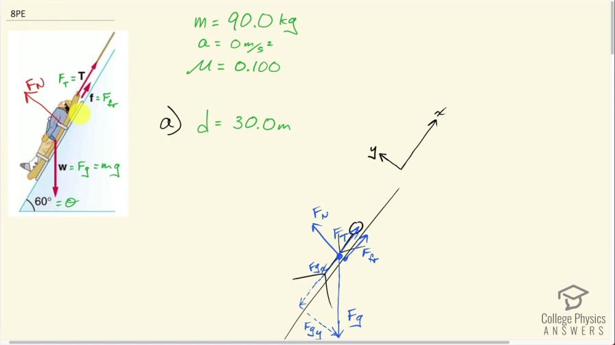 This is College Physics Answers with Shaun Dychko. This poor ski accident victim is being lowered down a snowy slope at constant speed, which means there's no acceleration, there's a tension force directed up the slope and also some friction directed up the slope as the skier is sliding down and there's a weight straight down and there's also a normal force perpendicular to the surface of the slope in this direction here. So there are a total of four forces on the skier and I have redrawn these forces over here where I have also done a little trick with our coordinate system and I have aligned the x-axis to be along the slope. You can choose any coordinate system you want in any question; conventionally, the coordinate system is y-axis straight up and x-axis positive to the right but in this question, it is more convenient for us to rotate our coordinate system so that we have x positive up the slope and y positive perpendicular to the slope. So we have the same four forces on this picture but I have drawn the components of gravity— the components that are parallel and perpendicular— to the coordinate system here... to the x-axis or to the slope. So we have gravity straight down still, this is no longer called the y-direction instead the y-direction is perpendicular to the slope so that means F g y here is negative because it's going the opposite direction that we have defined as positive— positive is up and to the left— and we have a component of gravity in the x-direction, which is down the slope and that's going to be negative as well. Okay! We know that the skier is going to travel 30.0 meters down the slope— we are told that in the question— and the mass of the skier and the sled is 90.0 kilograms, there's no acceleration which is another way of saying constant speed and the coefficient of kinetic friction between the sled and the snow is 0.100. Alright! So we always start our question by writing down the things that we know that we are given... I usually do that in green color. Alright! The slope is inclined at 60 degrees, with respect to horizontal, and in order to figure out the components of gravity here, we will need to figure out what the angles are in this triangle. So I am going to redraw this triangle off to the side a little bit... this triangle here I am going to redraw it with the slope angle here so that we can see which angle in the triangle corresponds to this angle of the slope. So imagine we have this slope here, we have gravity straight down like this and we know this angle here is θ— 60 degrees— and this is a right angle for sure because this is gravity straight down and the ground is horizontal and that makes this angle up here 90 minus θ because this angle in the top of this triangle plus θ have to total 90 since this angle here is 90 and the interior angles of a triangle have to total 180 so with 90 taken out by this right angle that leaves 90 left over for the sum of these two and so this one has to be 90 less than θ. Okay! So if we know that, it's 90 minus θ and that's this angle here that we just were talking about and this one is certainly 90 degrees because it's the angle between perpendicular components and that makes this angle here equal to θ because this one here is 90 minus θ and this angle has to be 90 minus that 90 minus θ which is 90 minus 90, which is 0, plus θ so in other words, this angle here is θ. Let's keep that in mind as we go forward and figure out components of gravity here. Okay! So consider the y-direction first. We know that the normal force in the positive y-direction is equal to the total forces in the negative y-direction of which there's only one... there's only the component of gravity that is directed in the negative y-direction and those are the only two things we have to think about in the y-direction. So the normal force is positive and then the y-component of gravity is in the minus direction and I like to put that minus explicitly in a formula and that totals 0 because there is no acceleration, it totals mass times acceleration in the y-direction because this is the net force in the y-direction but there's no acceleration so that's why there's a 0 there. And we can also say that the y-component of gravity is the weight mg times cos θ because this y-component is the adjacent leg of this gravity triangle and to find the adjacent leg, we multiply cosine of the angle by the hypotenuse so that's what we are doing here— the hypotenuse is mg. Okay! So we substitute that in place of F g y— that's what I have shown here in red— and that's all we can do for the y-direction. So then we turn our attention to the x-direction and we say that this friction force that is directed up the slope has to equal the normal force times the coefficient of friction. And so then we can create an expression for normal force now by dividing both sides by μ and then switch the sides around and we get normal force then is friction force divided by μ and we can substitute that in place of normal force in the y-direction formula, which is what we do here. And now we can add mgcos θ to both sides and then multiply both sides by μ and we end up with μmgcos θ is the force of friction. By the way, I don't think I made this clear in the beginning but the point of this question in part (a) is to figure out the work done by friction and so the work done is the force multiplied by the parallel component of the displacement and then that's going to be the distance, which is 30 meters, times cosine of the angle between the displacement and the friction force. But the angle is 180 degrees because the friction is directed up the slope and the displacement is down the slope and so the angle between them is 180 and that cos of 180 is what's going to give us our negative sign in our answer here. So the friction force—we did all this work to figure out what it is— and it's μmgcos θ so we substitute that in and we multiply that b