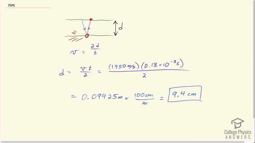 This is College Physics Answers with Shaun Dychko. Ultrasound is being transmitted through a layer of fat and then it reflects off of this interface between media— there must be some other type of tissue down here— it reflects off that and then goes back to the beginning where there's also a detector so this wand that the technician puts on the tissue has both a transmitter of ultrasound and a microphone to detect the return signal. So it has to travel through this fat layer twice so we will say that the fat layer has a thickness—we will call it d— and so the total distance that's being traveled is 2 times d because once down and then again back up and I have drawn it on an angle here so that just to make it clear that the signal goes down on the one hand and then back up and this path length is greater than d... this is, you know, the hypotenuse of this triangle here but we will just ignore that... imagine that it's going straight down and then straight back up... I did it at an angle just for illustration purposes. So the sound has to go 2 times the thickness of the fat and then that's divided by time gives us this speed. Now we know the speed because we can look that up in table [17.5]— the speed of ultrasound in fat tissue is 1450 meters per second. So we can rearrange this to solve for d, which is the thickness of the fat, which is what we want to know so we multiply both sides by t over 2 and then switch the sides around and we are left with d equals vt over 2. So that's 1450 meters per second— speed of ultrasound in fat— times the time of 0.13 milliseconds, which is times 10 to the minus 3 seconds, divided by 2 and that's 0.09425 meters, which we convert into centimeters by multiplying by 100 centimeters for every meter and after rounding, we get 9.4 centimeters.