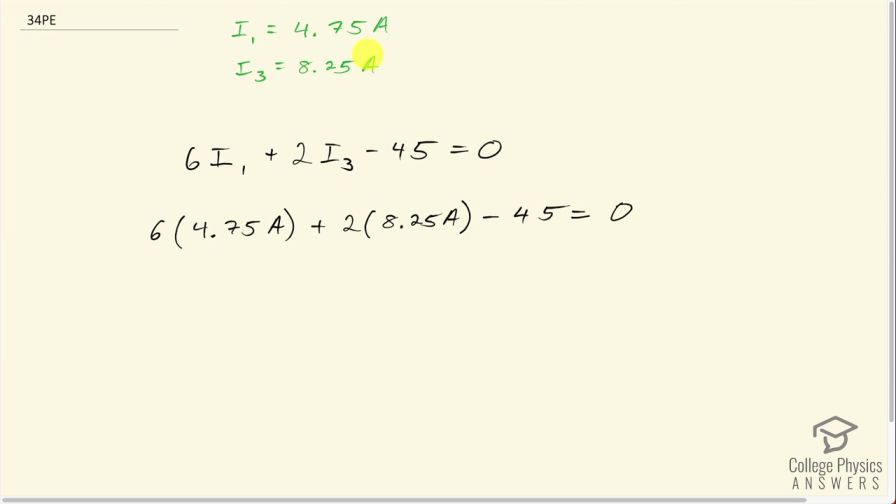 This is College Physics Answers with Shaun Dychko. In this problem, we practice checking our answers in solving a circuit. So if we have some answers: here's current I 1 and current I 3 that are given to us in example [21.5], we can substitute those values into each of the equations that we have created to find these answers and the equation should be true with these numbers substituted in. Here's the third equation in the solution which is 6I 1 plus 2I 3 minus 45 equals 0 and if we substitute 4.75 amps in for I 1 and 8.25 amps for I 3 and then do this calculation we should confirm that it does indeed equal 0 and it does!