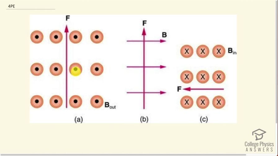 This is College Physics Answers with Shaun Dychko. We are going to determine the direction of the velocity of a positive charge given the direction of the magnetic field and the direction of the force the charge experiences due to the magnetic field in each of these three scenarios. So we are going to use the right hand rule which says that we point our fingers in the direction of the magnetic field and you can remember that the fingers go in the direction of the magnetic field because there are many magnetic field lines and you have many fingers and so those are going to point out of the page with your right hand and the palm is going to be in the direction of the force and you can remember that because palms push things and exert forces on things— that's a way to remember that the palm is in the direction of the force so your palm is facing upwards— and when you have your hand arranged this way, your thumb is pointing to the left so the direction of the velocity of this charge is to the left. Now in part (b), we have our fingers pointing to the right and our palm is facing upwards and now our thumb is pointing straight out of the page and the thumb is the direction of the velocity of the positive charge and so we can draw a dot surrounded by a circle— this dot represents the point of an arrow coming out of the page towards us. And then in part (c), we have our fingers going in to the page because these are like tail feathers of an arrow going away from us so the magnetic field lines are in to the page. And we have our palm facing to the left because the palm is the direction of the force and our thumb is pointing upwards so the velocity is up in this part. There we go!