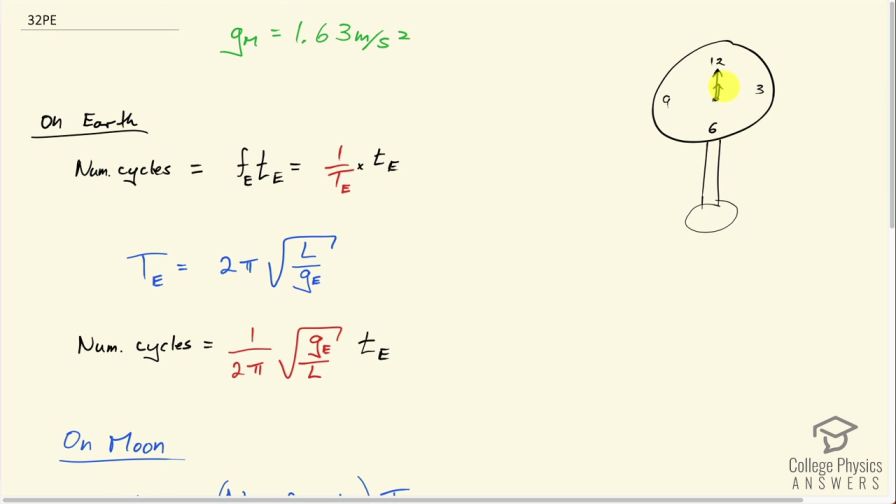 This is College Physics Answers with Shaun Dychko. We imagine that a pendulum clock which operates nicely on Earth— which is to say that the hour hand takes 12 hours to go around one time— that pendulum clock is placed on the Moon, where the acceleration due to gravity is only 1.63 meters per second squared and the question is how much time will pass for this hour hand to go around one full rotation? So the way the clock is designed is that when this pendulum goes back and forth in one particular cycle, the gears inside the clock mechanism will advance the hour hand some given amount and it's calibrated for Earth such that a certain number of swings will cause the hour hand to do one full rotation in 12 hours. And on the Moon though the pendulum will be having a different period and so that same number of cycles will be needed but it will take a different amount of time for those cycles to occur. Okay! So the first part of our solution is to figure out how many cycles are needed for this pendulum in order for the clock to indicate 12 hours has passed? So the number of cycles is frequency multiplied by time or we will take the reciprocal of the period and replace frequency with that because we have a formula for the period of a pendulum and I have subscript E on here to indicate that these are quantities on the Earth. So we have the period of the pendulum on Earth and we are going to multiply that by the amount of time that passes on Earth, which is 12 hours, and then that will be the number of cycles the pendulum needs to do in order for the hour hand to get advanced one rotation. So this is the length of the pendulum, which we don't know, divided by acceleration due to gravity on the Earth and we are taking the square root of that quotient and multiplying by 2π to get the period of the pendulum on Earth and this formula takes the reciprocal of that period so I am taking the reciprocal of this expression and writing it here. So this is 1 over 2π times square root of acceleration due to gravity on Earth divided by the pendulum length. And we are multiplying that by the amount of time that passes on Earth— which is 12 hours—to get the number of cycles. Okay! Then on the Moon, it's basically this formula but we have solved for time but now it's time that is going to be passing on the Moon and that will equal some number of cycles that we have calculated here multiplied by the period of the pendulum on the Moon so number of cycles times period. So number of cycles is this being copied here where I have put the factor time on Earth in the numerator here and then multiplying by the same period formula but now with the acceleration due to gravity on the Moon. And then the 2π's cancel and the square root lengths cancel and we are left with the time that's passed on Earth multiplied by the square root of acceleration due to gravity on Earth divided by acceleration due to gravity on the Moon. So 12 hours has to pass in order for the hour hand to make one rotation and multiply that by square root of 9.8 meters per second squared divided by 1.63 meters per second squared and 29.4 hours will need to pass in order for the hour hand to make one full rotation on the Moon.